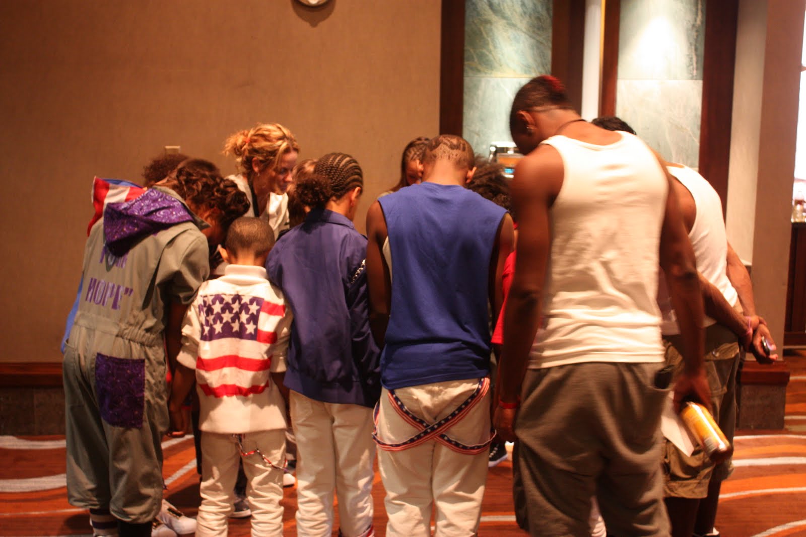 MOMZ-N-DA HOOD's Barb Adler, Lori Lee and Sue Estep have a little fun with Mookie The MC in the press row after he called his ever present bloggers "his favorite Momz that don't look like moms"